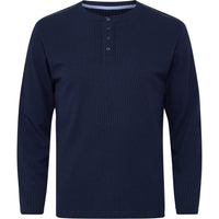 Langærmet granddad T-shirt med struktur i stoffet og knaplukning i halsen. Materialet er en blød og slidstærk blanding af polyester og bomuld, der holder formen. En afslappet klassiker med lidt ekstra tekstur.