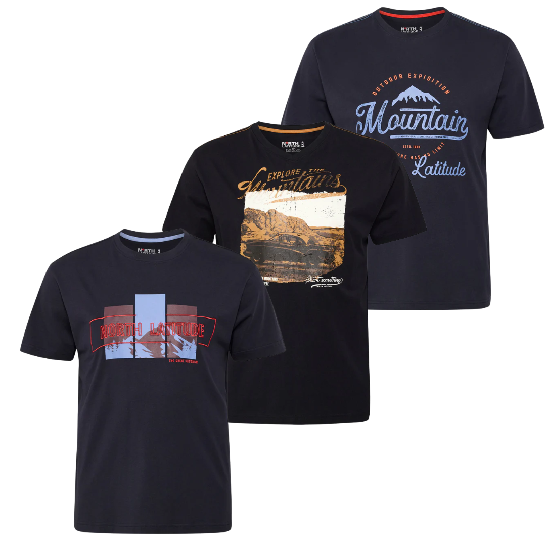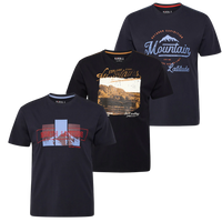 Pakken indeholder tre T-shirts med grafiske prints inspireret af bjerge, natur og outdoor-liv. En kombination af stil og komfort, der gør dem perfekte til både hverdagen og fritiden.