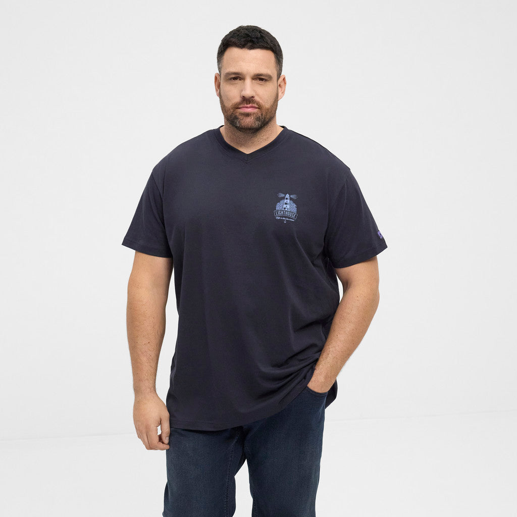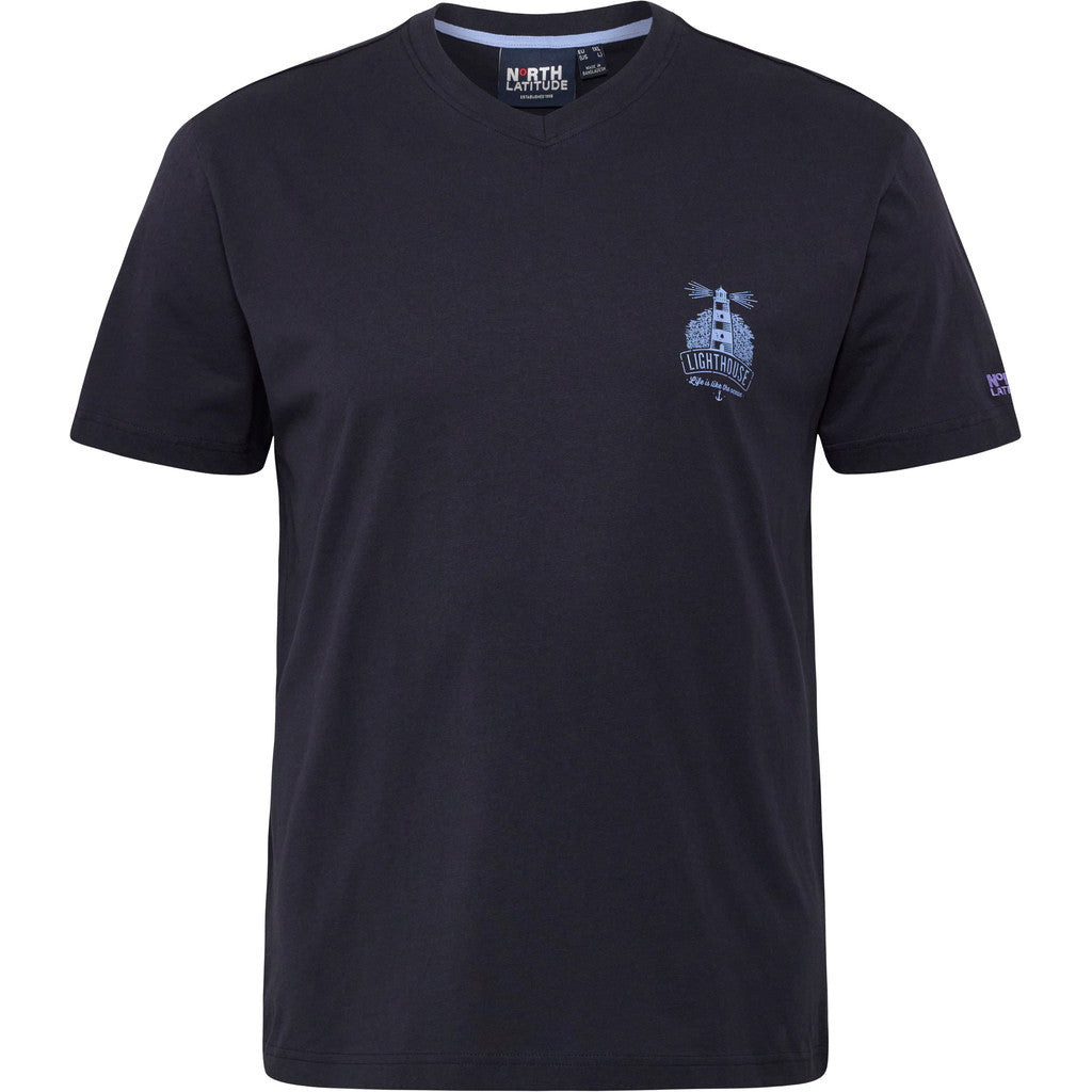 Afslappet T-shirt med V-hals og lille print på brystet. Lavet i blød bomuld med en behagelig pasform, der giver plads til bevægelse. En enkel hverdagsfavorit med et diskret grafisk udtryk.